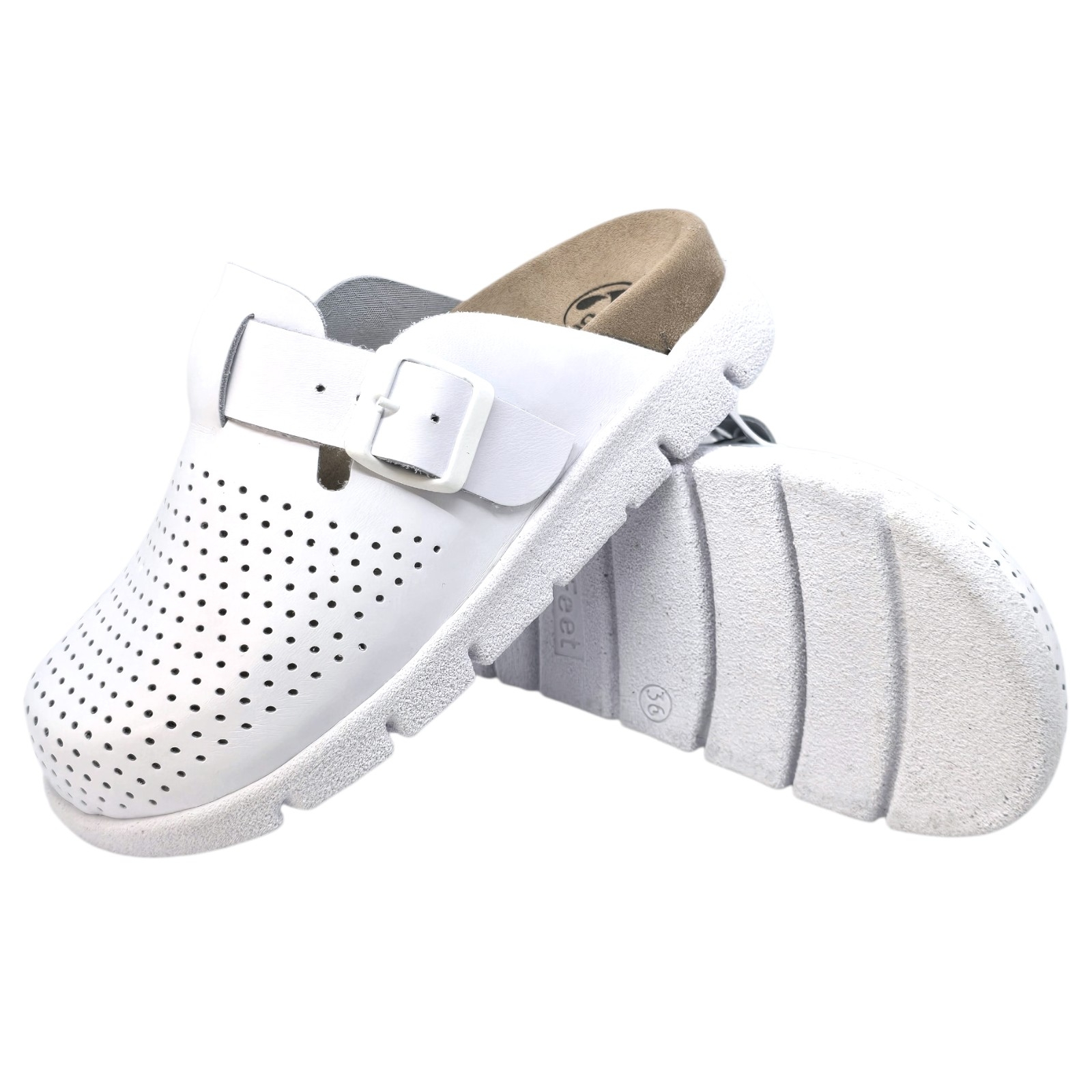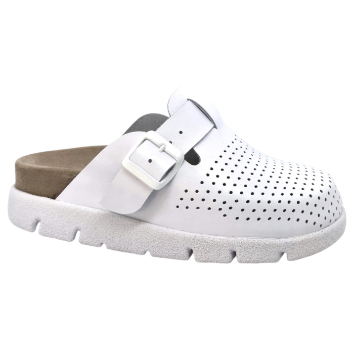 A Dr. Feet márkájú, 22100-as modellű fehér klumpa a legújabb divattrendek és a fokozott kényelem tökéletes ötvözete. Ideális választás otthonra, munkába vagy a legpörgősebb hétköznapokra is, hiszen stílust és komfortot biztosít egyszerre. A legjobb minőségű olasz valódi bőrből készült, így egyesíti magában a luxust, az eleganciát és a tartósságot.