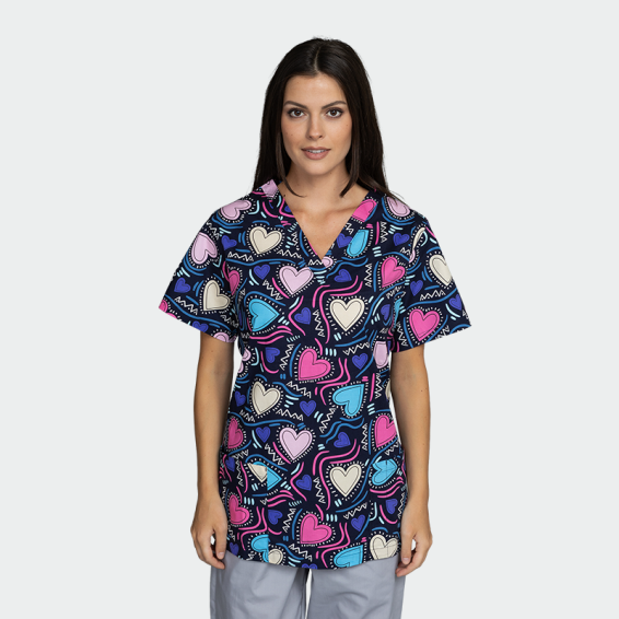 Fekete színű női orvosi felső, színes szívecskés mintával, rövid ujjal, V-nyakkivágással, enyhén karcsúsított szabással és elöl két rávarrt zsebbel.